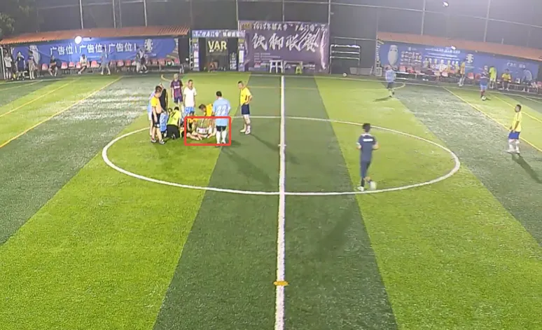 当时,足球场正酣战,只见站在球场中心的某男子,低头蜷缩,双手扶住膝盖,失去重心向后倒地。球友第一时间发现异常叫停比赛,并反应迅速,取来AED与死神奋力搏斗。
