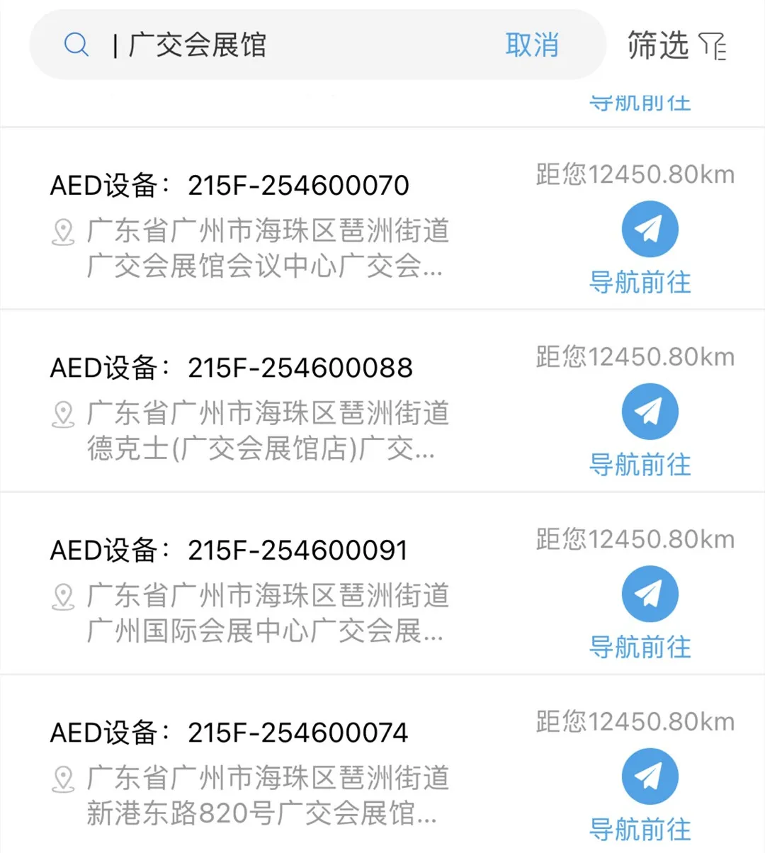 当展馆内发生紧急情况时,也可通过“广州健康通”小程序点击AED地图,3D立体导航将指引最近设备位置。